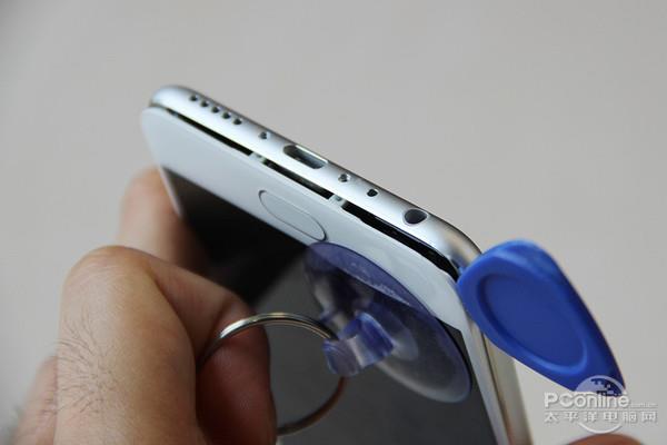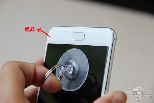 用吸盘吸起屏幕的下半部分,让中框与后壳之间有一定的缝隙。