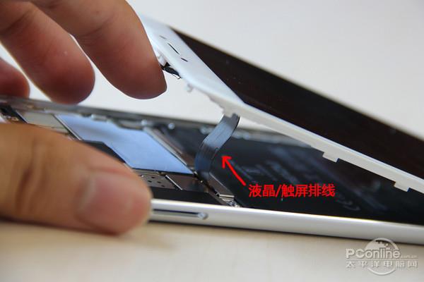 分离后我们看到mTouch按键的排线,伸出位置与iPhone相似,拆卸起来没有MX5方便(MX5的mTouch排线与液晶排线设计在同一位置)。这儿要小心扯,一不小心就会扯断。