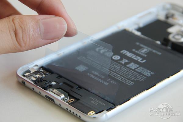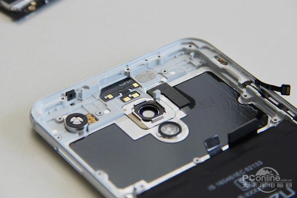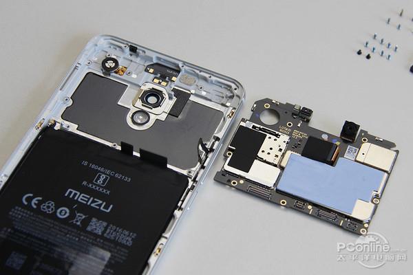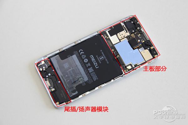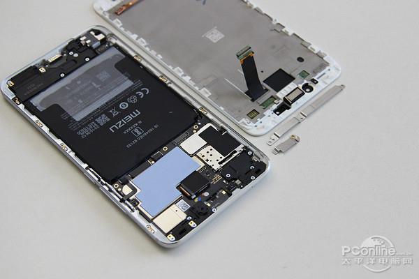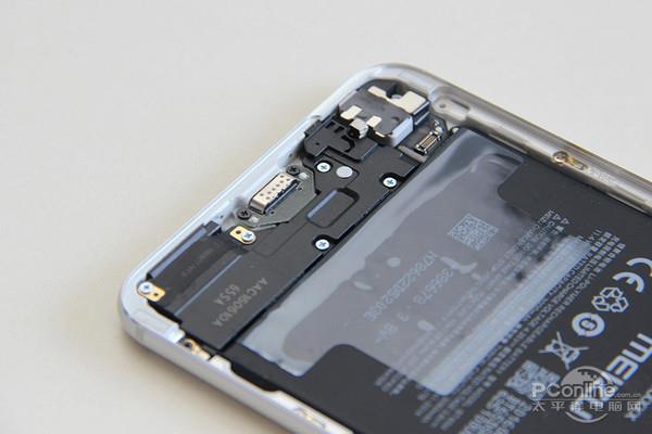 屏幕/中框与机身彻底分离之后,我们可以看到MX6沿用了MX5的三段式设计,但是主板的布局明显整齐了不少,而且黑色的PCB板看起来也更加高端。