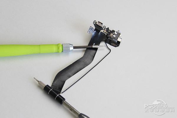扬声器模块通过触点与底下的排线相连接,而在这里我们可以发现尾插、主天线、3.5mm耳机口、mTouch的排线是一体的。