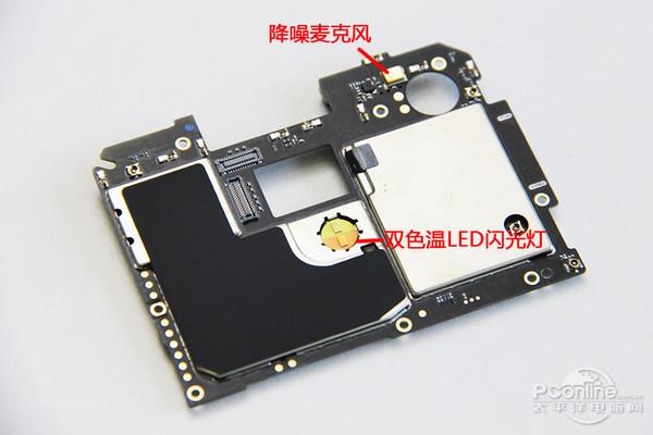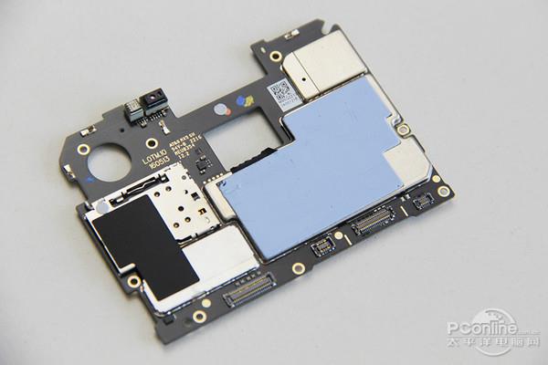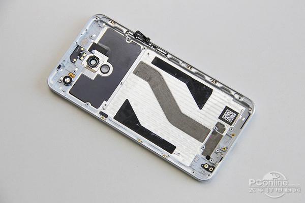 主板的另一面,除了屏蔽罩之外还覆盖了一层导热硅脂,热量可以通过硅脂传导到后壳的石墨导热层,让整个金属后壳受热更均匀,也更容易散发。估计Helio X20处理器、32GB的eMMC 5.1就在底部。
