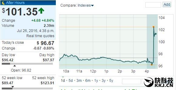 虽说利润下滑,但苹果的股价似乎却出现了反弹,截至美国东部时间17:11(北京时间27日5:11)的盘后交易中,苹果股价上涨6.57美元,至103.24美元,涨幅为6.80%。过去52周,苹果的最高股价为123.91美元,最低股价为89.47美元。