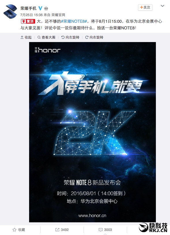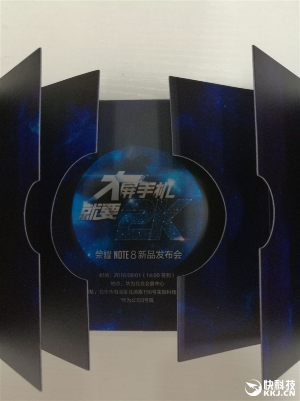 华为荣耀将于8月1日在京发布6.6寸的2K分辨率巨屏机“荣耀NOTE8”,邀请函同样很会玩。