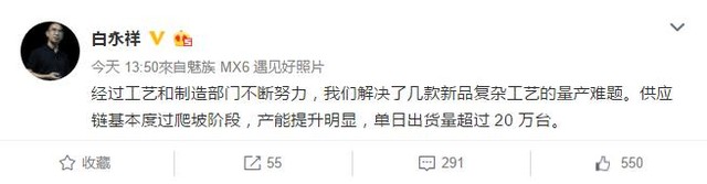 白永祥:魅族单日出货量已超20万台(图片来自微博)