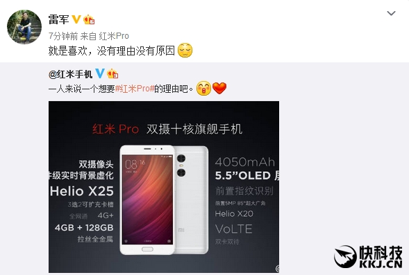 红米手机官微发起了一个小活动,一人来说一个想要红米Pro的理由,而雷军给出的理由是:“就是喜欢,没有理由没有原因。