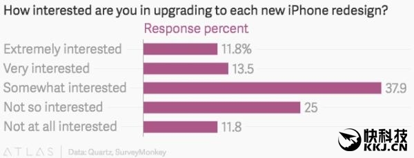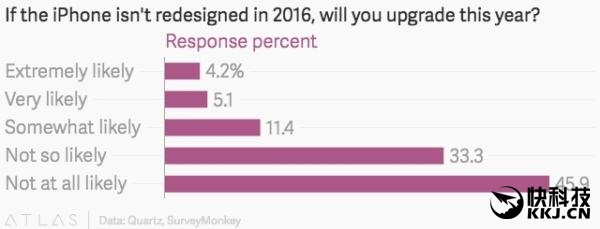 从实际数据看,有10%的用户表示愿意第一时间入手iPhone 7,即使它没有新的外形设计,而25%的受访者表示,他们通常对于更新到有新设计的iPhone“极度”或“非常”感兴趣。