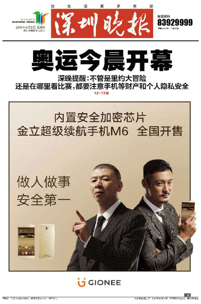 在奥运会开幕当天,各大报纸网站都会切合这一热点在头版头条刊登了奥运开幕的信息。其中,《深圳晚报》头版十分引人注目。除了版面上方描黑加粗的“奥运今晨开幕”的新闻外,下方的金立M6开售海报尤其突出,结合里约奥运会不断爆出的安全事件,这张海报以“做人做事 安全第一”为广告语,既贴合了近期的奥运热点,也将金立M6高安全性的产品卖点结合奥运热点淋漓展现,与奥运开幕头版新闻巧妙结合。