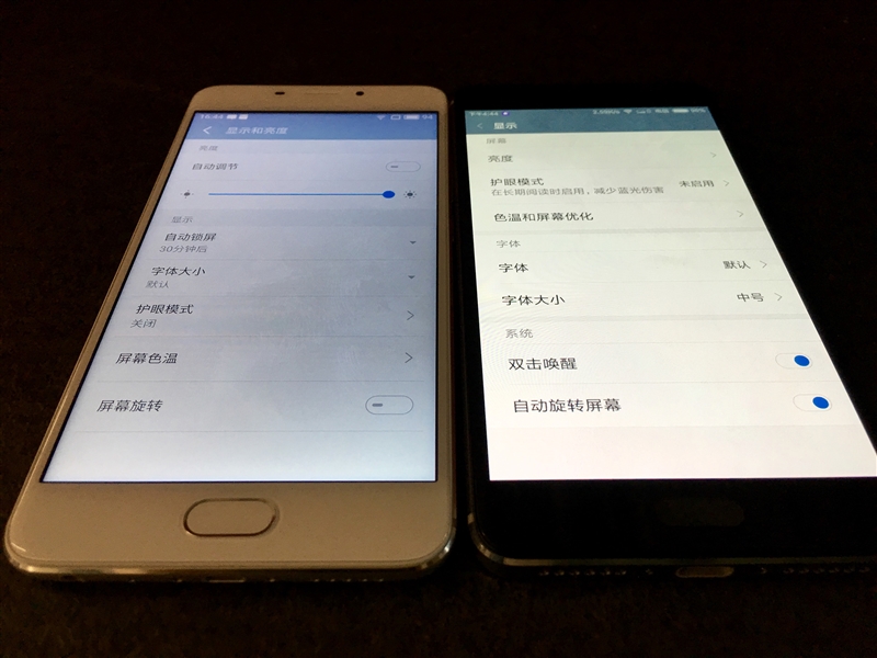 至于哪个更好的命题,其实还是见仁见智,看实际的调校,只要显示效果好,那就是好屏。魅蓝E的屏幕显示不错,色彩还原较好,并且系统还支持护眼模式。从对比来看,魅族E显示偏冷,而红米Pro偏暖,红米Pro可视角度略优于魅蓝E。