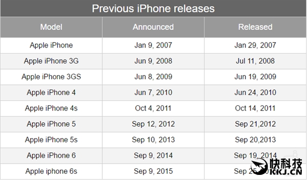 历届iPhone的发布时间,看起来9月7日还是很靠谱的。
