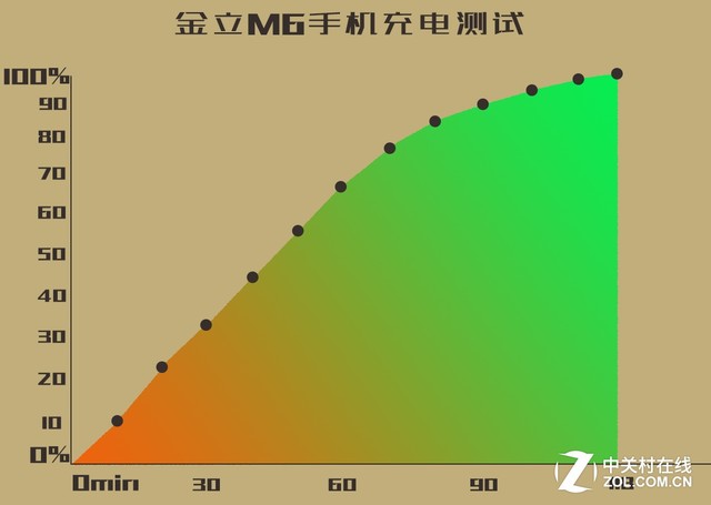 充电速度方面,金立M6支持9V-2A快速充电,从电量耗尽充至100%共耗时118分钟,由于电池容量过大,所以这一时间完全在可接受范围内,对于如今用户碎片化的充电时间也能快速积蓄电量,完全没电后充半小时甚至二十分钟即可放心出门,当然此时搭配省电模式会更令人安心,总体来说,金立M6续航、充电测试结果令人满意,超出预期,并且完全超越目前大部分Android手机续航成绩。