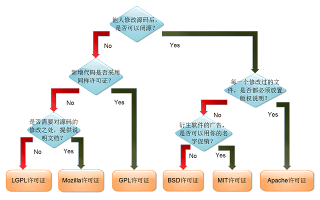 除了上面的集中开源协议,还有MIT许可证(源自麻省理工,是与BSD一样宽范的许可协议)和Mozilla许可证等,具体可参照下图。