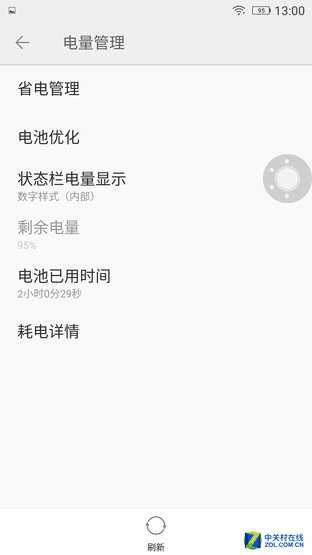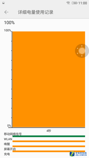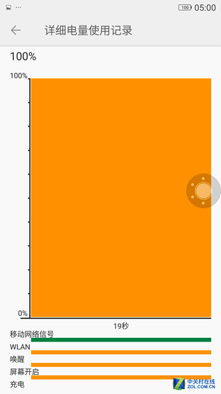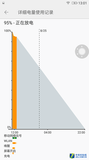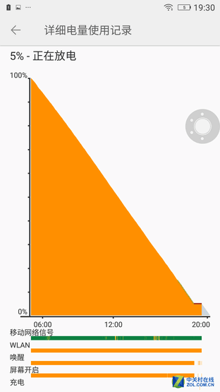 测试从上午11点开始,20分钟的在线视频消耗了2%电量,10分钟网页浏览再消耗2%电量;20分钟的熄屏在线音乐播放损耗的电量不到1%,之后70分钟的熄屏待机,到13点测试完毕时,剩余电量95%。以此表现来看,金立M6 Plus在轻度使用环境下一次充电可以坚持两天,即使重度用户也能持续一整天的时间。