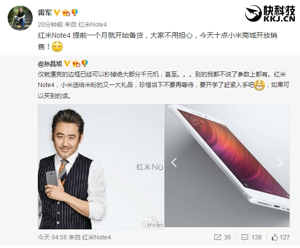 红米Note 4定于今天上午10点第二轮开卖,雷军刚刚再度回应外界表示,红米Note 4在发布会前一个月就开始了备货,明天上午在小米商城里会有大量现货,大家不用担心