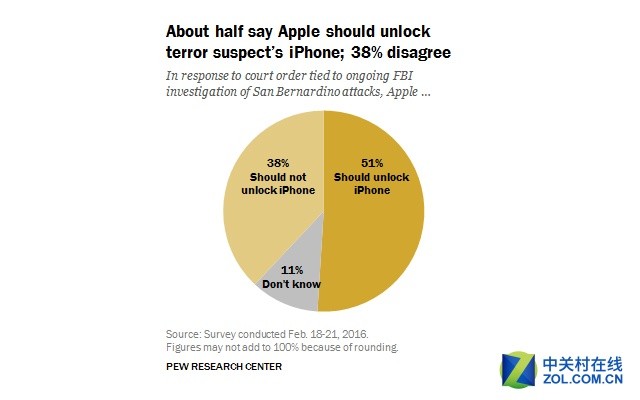 不过,根据皮尤对美国民众展开的调查显示,大众对于此事的看法却有着明显的不同。现在已有51%的受访者表示支持FBI的要求,认为苹果应该协助警方解锁恐怖分子的iPhone;而38%的受访者则认为应当保护用户的隐私权,苹果不应该解锁手机;余下的11%受访者则表示对这件事不了解。
