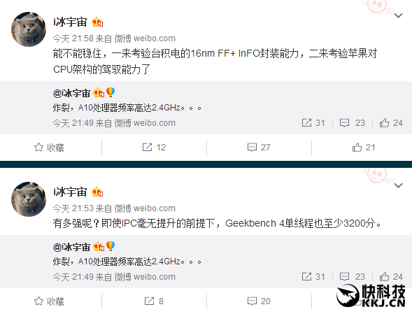 根据微博网友@i 冰宇宙的最新曝料,A10处理器的频率将高达2.4GHz,比之A9猛然提升足足30%。