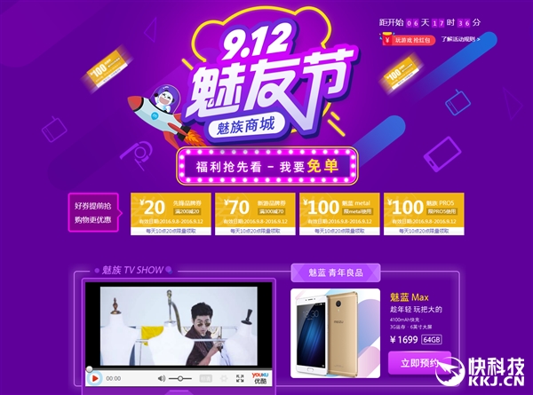 既然是第一次,活动内容自然相当丰盛,首要的就是新品魅蓝Max,9月12日上午10点在魅族商城独家首发预售,数量为3000台,而其他渠道要等到15日上午10点。