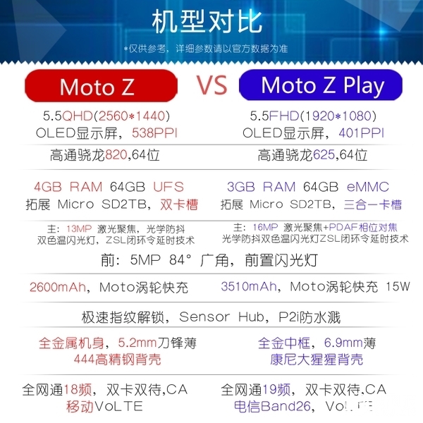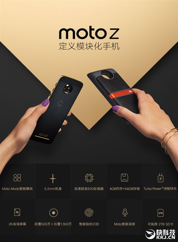 在此之前,Moto Z的配置已经完全公布,拥有5.2mm的超薄设计,号称全球最薄的金属智能手机,搭载骁龙820处理器,采用5.5英寸2K屏,内存组合是4GB RAM+64GB ROM,摄像头前置500万+后置1300万像素,电池容量2600mAh。