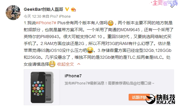 现在,网友GeekBar创始人磊哥在微博上爆料称,iPhone 7 Plus会有两个版本,两个版本主要不同的地方就是射频部分,也就是基带方案不同。一个采用了高通的MDM9645,还有一个采用了英特尔的PMB9943(很大可能支持CAT.10)。