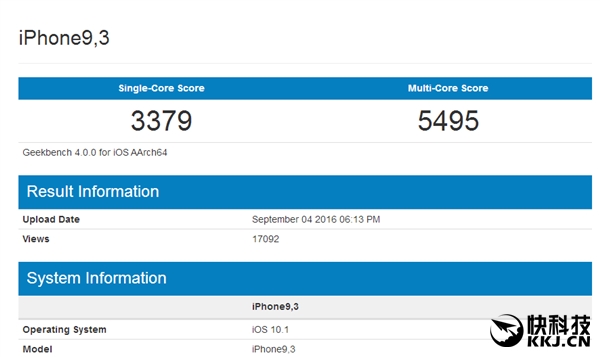 iPhone9,3对应就是iPhone 7,虽然内置2GB内存,但是整体性能成绩与iPhone 7 Plus基本保持在同一水平线,单核3379多核5495,整体来说这次新iPhone的性能提升,主要是靠A10的频率的提高。