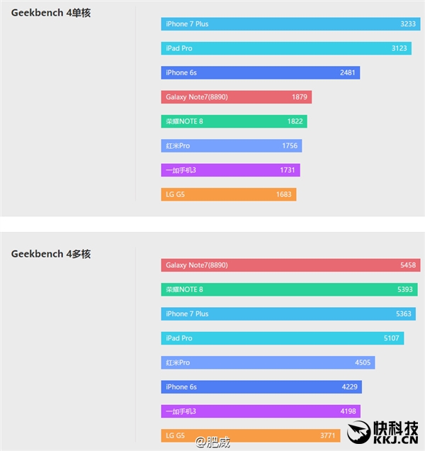 多核的成绩表现,iPhone 7 Plus依然要高于iPad Pro,但少落后Note 7,这样的表现果粉应该很满意了吧。