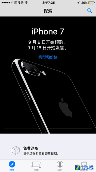 中关村在线消息:今天下午3:01分开始苹果官网正式接受iPhone7第一轮预购,发货时间是9月16号,参与门店预约的小伙伴可在9月16号预定门店提货购买。官网预购两个渠道,一是进入网页苹果商场二是通过APP版Apple Store进行。没有苹果帐号嫌麻烦的小伙伴,可以通过天猫商城Apple Store旗舰店进行首轮预购。