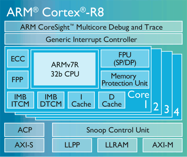 Cortex-R8在架构设计上基本延续了Cortex-R7的特点,是11级乱序流水线,ARMv7-R指令集,向下兼容,不过Cortex-R8支持最多四个核心,各个核心可以非对称运行,有自己的电源管理,所以能单独关闭以省电。每个核心还可以搭配最多2MB低延迟的紧耦合缓存(TCM),包括1MB指令、1MB数据,整个处理器最多8MB。相比之下,Cortex-R7每个核心最多只有128KB指令/数据缓存。