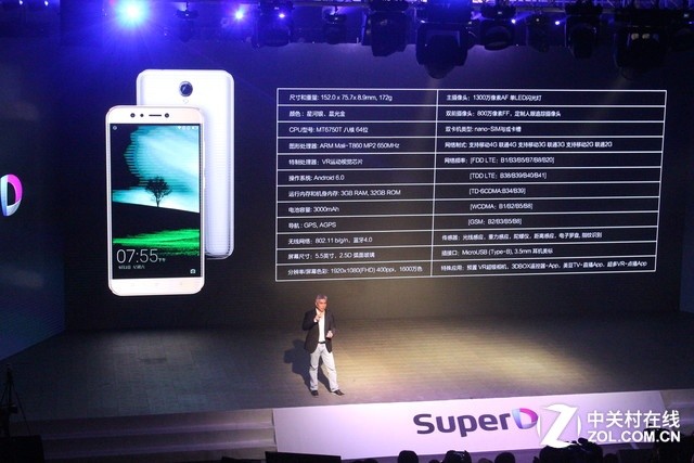 在配置方面该机使用了一块1920x1080像素分辨率的5.5英寸屏幕,搭载联发科MT6750T八核64位处理器,内置3GB运行内存和32GB本地存储空间,前置采用双摄像头分别为一颗800万像素摄像头和一颗人眼追踪摄像头,主摄像头为1300万像素,配有3000mAh容量电池,支持指纹识别预装安卓6.0系统。提供晨光金、星河银两种配色。