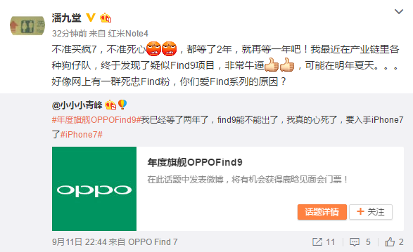 中关村在线消息:OPPO的Find和N系列产品线自Find 7、N3以来一直没有得到更新;关于Find系列新机Find 9的消息少之又少;现在终于又有新消息曝出,电子行业分析师潘九堂在微博表示,“不准买疯7,不准死心,都等了2年,就再等一年吧!我最近在产业链里各种狗仔队,终于发现了疑似Find9项目,非常牛逼,可能在明年夏天。。。”
