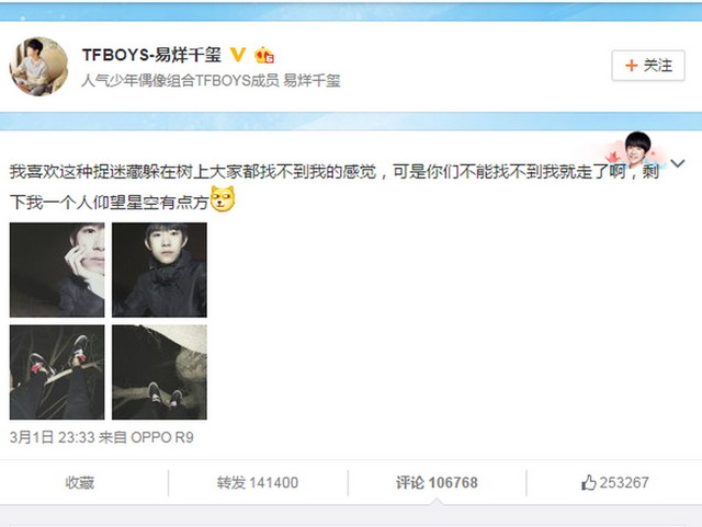 TFBOYS-易烊千玺使用OPPO R7发微博(图片来自新浪微博)
