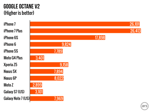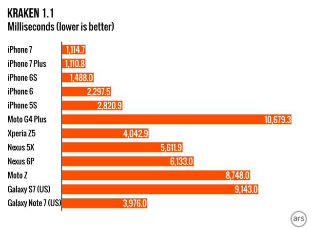 涉及到网页浏览性能的Google Octane以及Kraken,其他机型同样一点儿都不是iPhone7系列的对手,就连iPhone 6和6s还能再战两年;不过在旗舰机上面,像网页这种轻任务在目前也很难看出性能差别。