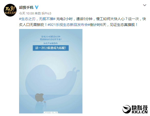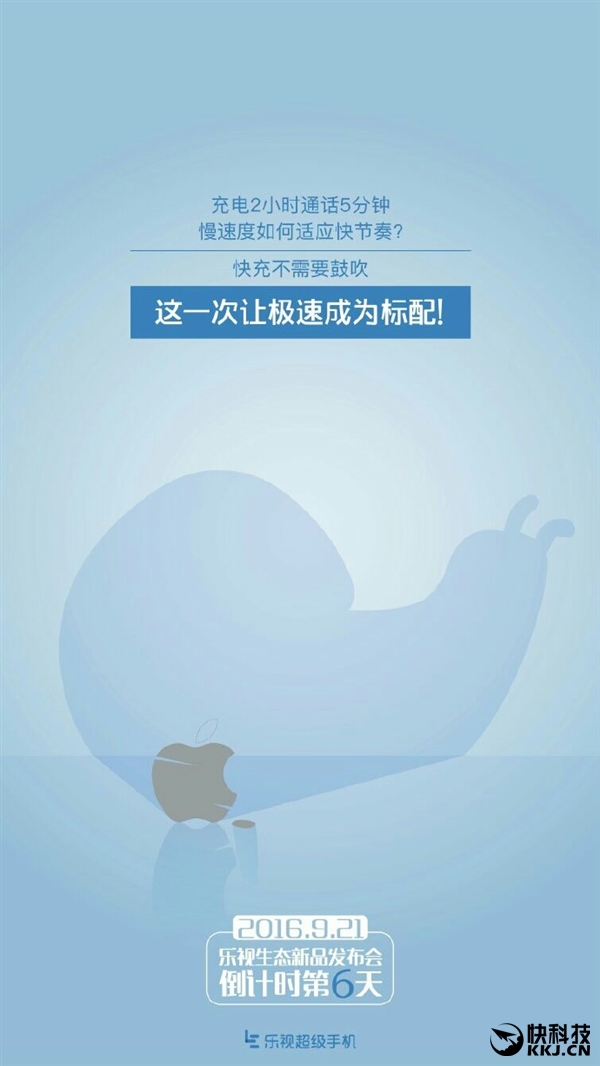 今日,官微再次发布倒计时6天海报,从中可以看出即将发布的乐Pro3采用乐视最新的快充技术,充电性能相比上代有望得到进一步提升。另外,这个海报也有着一语双关之意,暗示乐Pro3将标配快充和极速性能处理器。