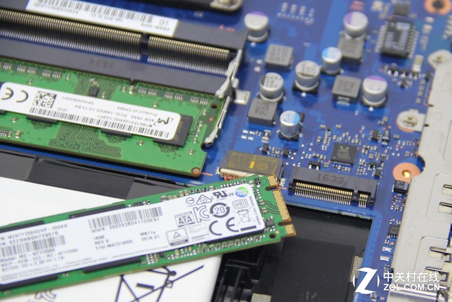 除了外观方面的特色外,该机还拥有双硬盘设计。其内部拥有SATA和M.2接口,可以同时安装两块硬盘。这在目前低价笔记本中并不多见。我们通过拆解来看一下双硬盘是如何设计的。