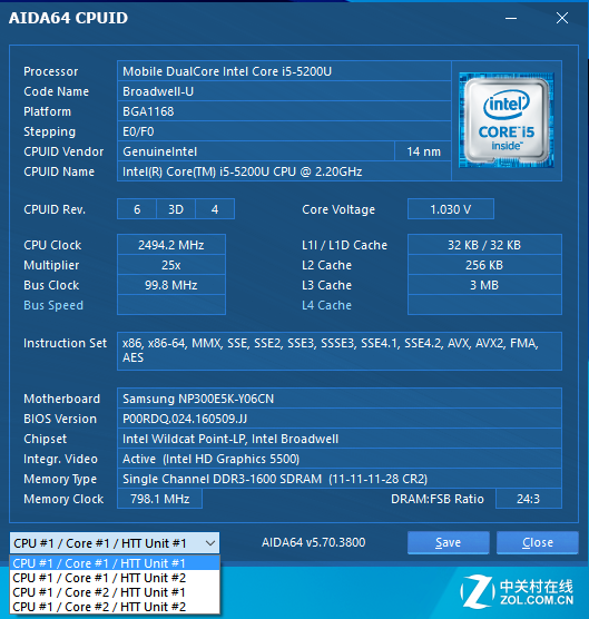 从AIDA 64 CPUID可以看到本机搭载的英特尔酷睿i5-5200U处理器,基于14nm制程,核心代号为Broadwell-U,采用双核心四线程设计,默认主频为2.2GHz,支持睿频至2.7GHz,3级缓存3MB,TDP为15W。