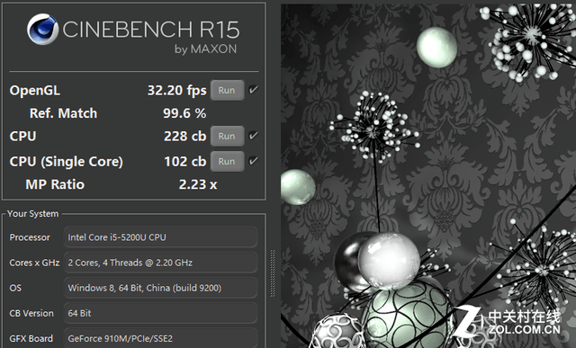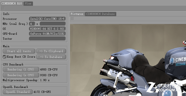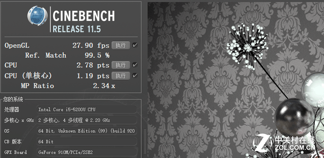 处理器性能方面我们采用三款同系列测试软件CINEBENCH对其性能测试,得出的结果仅供参考。首先是CINEBENCH R10的测试结果,该处理器获得单核4900分,多核9300分;在CINEBENCH R11.5测试中,该处理器多核心获得2.78pts,单核心1.19pts;最后在CINEBENCH R15测试中,该处理器多核心获得228cb,单核心102cb。处理器单项测试结果表明该处理器定位于移动平台处理器中端型号。