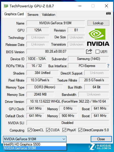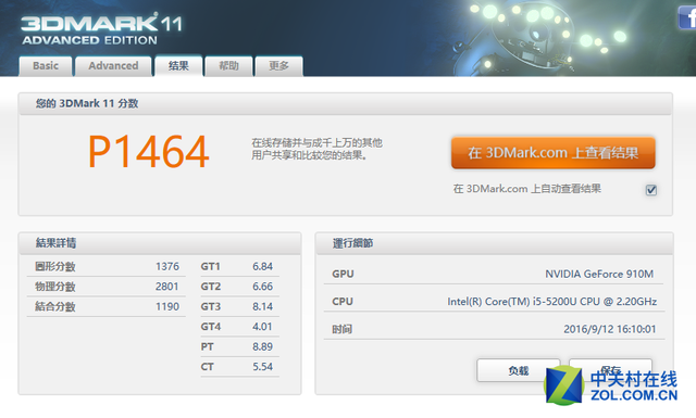 酷睿i5-5200U自带有HD 5500核芯显卡,三星额外配备了GT910M独显。这套组合在应对日常使用、商务办公方面性能还是足够的。在3DMark 11的P模式下测试可以看到,GT910M的分数达到了P1464,图形得分为1376,能够轻松应对日常及办公使用。
