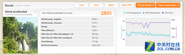 最后我们还采用了PCMark 8对产品的整体性能进行了评估,测试项目为Home accelerated,其主要包括Web浏览、文字处理、图片处理、视频处理、游戏等几个方面,贴近用户的实际应用模式,从最终2805分的成绩来看,该机是一款性能不错的笔记本。