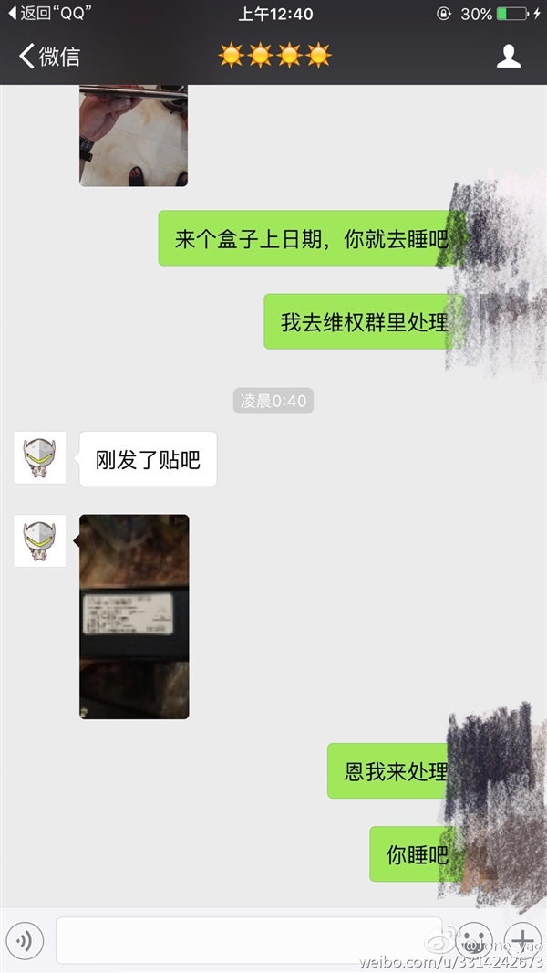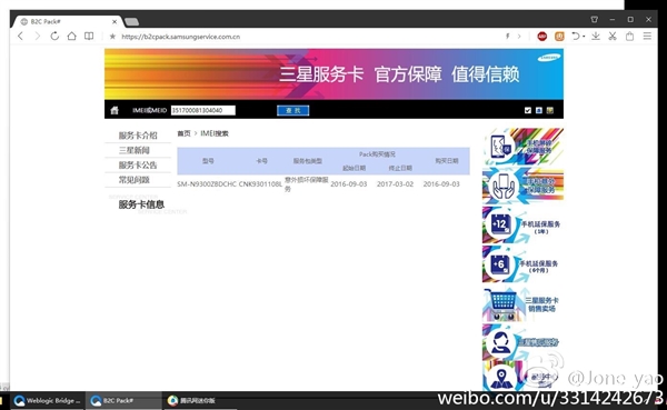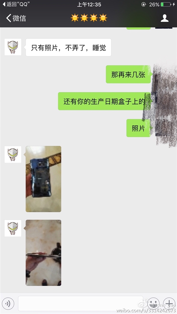 后有宣称是爆炸用户朋友的贴吧用户mcday、微博ID@Jone_yao补充称爆炸事实确凿,他不仅贴出微信截图,还给出了质保查询结果,显示“这台手机”9月3日开保,也就是不属于国行召回的那批正式开卖前的千人团体验机。