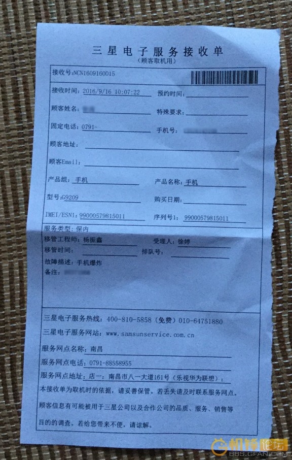 网友已经把手机、发票等都寄给了售后,等待三星处理,同时放出了三星售后给出的服务接收单,显示这部手机是2016年9月16日在南昌购买的,EMEI/序列号齐全,故障描述为“手机爆炸”。