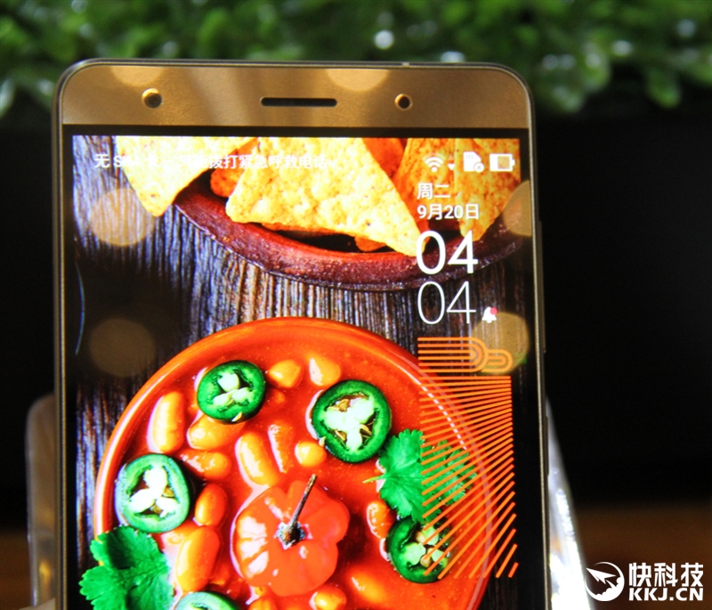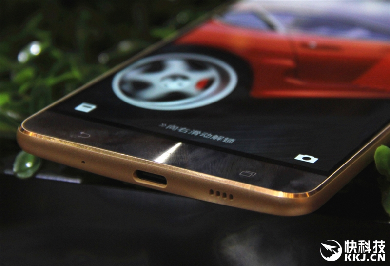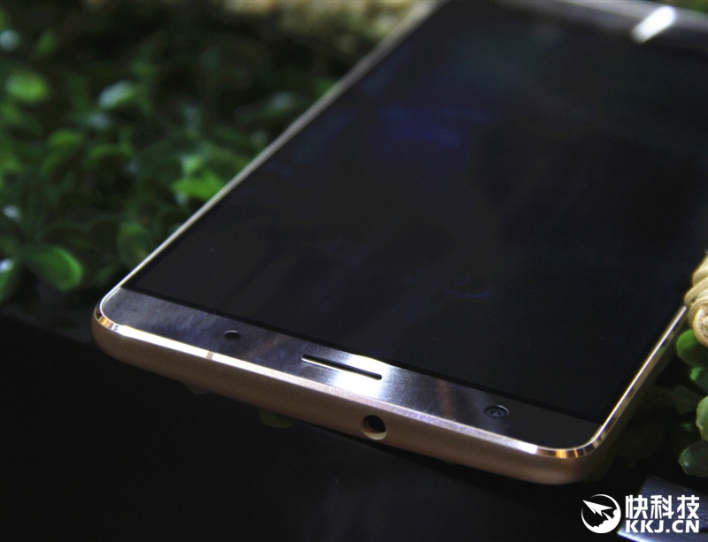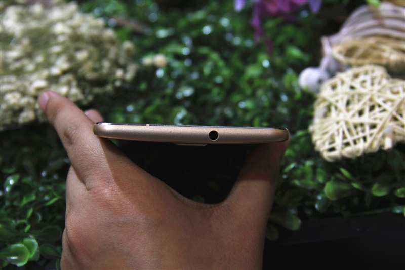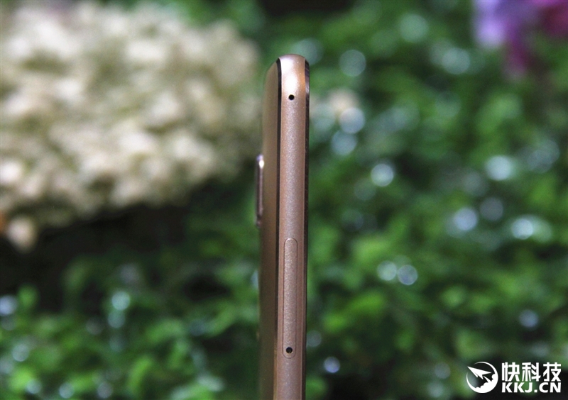 拿在手里感觉比较轻,不压手,感觉不到是一款5.7寸机型,三围官标是156.4x77.4x4.2 ~ 7.5mm,摄像头有凸起,金属包边。