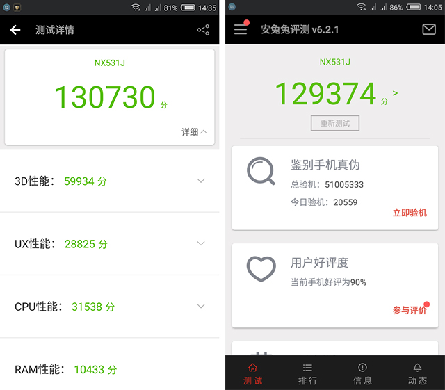 在安兔兔评测基准性能测试中,nubia Z11黑金版的总分达到了13万左右,属于骁龙820手机的正常水准。就实体体验来说,得意以骁龙820处理器和6GB超大运存,nubia Z11黑金版同时运行19个应用,依然可以在多个应用之间,实现自由切换。