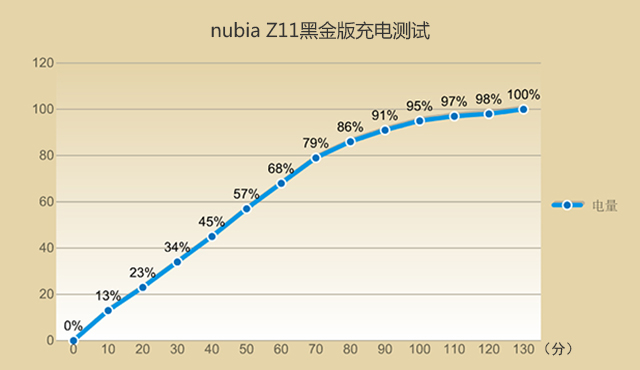 同时,nubia Z11黑金版也支持快充——nubia快充3.0。经我们实测证实,通过手机原装充电器为其充电,10分钟从0充至13%;30分钟充至34%;90分钟则充至91%,每10分钟平均充电10%左右。若是要完全充满,则需要两小时左右,并没有想象中那么快。