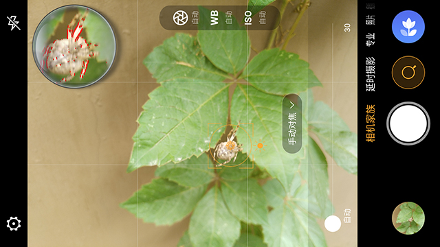 就样张效果来说,拍摄主体(注:蜘蛛)突出呈现,背景则做了明显的虚化处理,颇具层次感。同时,景物细节表现方面也较为不错,比如样张中的蜘蛛网丝清晰可辨。不过,与普通模式拍摄的微距样张相比,通过肉眼来看,二者的差异并不明显。感兴趣的朋友,也可以自行体验一番。