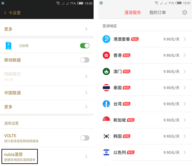 nubia Z11黑金版也加入了漫游服务,每天的价格一般是9.9元。对于手机的目标人群来说,这一点还是比较贴心的。同时,基于用户安全的考虑,它还加入了伪基站识别技术,以规避诈骗、骚扰信息,保证用户的财产安全。当然,nubia Z11黑金版也是一款全网通手机,移动、联通、电信4G/3G/2G都支持,也支持双卡盲插。对于多卡用户,以及小白用户来说,使用起来十分方便,不必再区分主副卡。