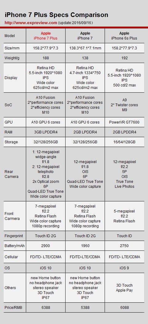 iPhone 7 Plus为5.5英寸1080p屏幕,可以横向显示,支持广色域,内部搭载A10 Fusion处理器,内存相比iPhone 7多了1GB,为3GB内存,存储空间有32/128/256GB可选。其它IP67防水溅、新home键、立体声扬声器、取消3.5mm耳机接口、450Mbps 4G LTE网络支持等都与iPhone 7一样。