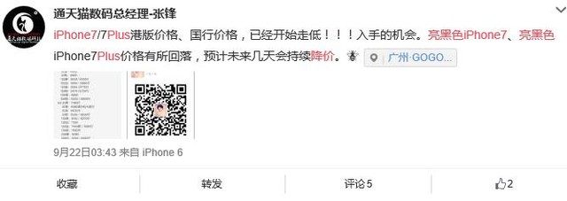 亮黑色iPhone7系列价格回落(截图来自微博)