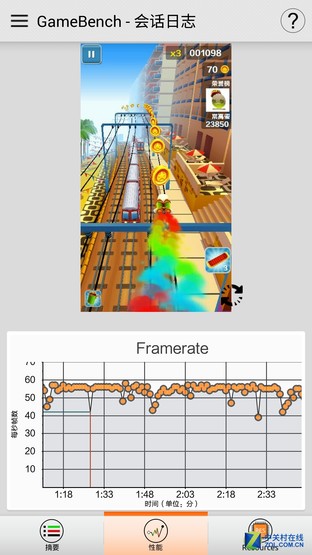 首先选择当前女性朋友热玩的中小型游戏进行测试;上图依次为开心消消乐和地铁跑步在GameBench监测下的平均帧数。从监测数据上来看,朵唯A8在运行中小游戏时,平均维持在50帧左右;而且游戏过程中,无卡顿掉帧的情况出现,中小型游戏对于朵唯A8没有挑战性。