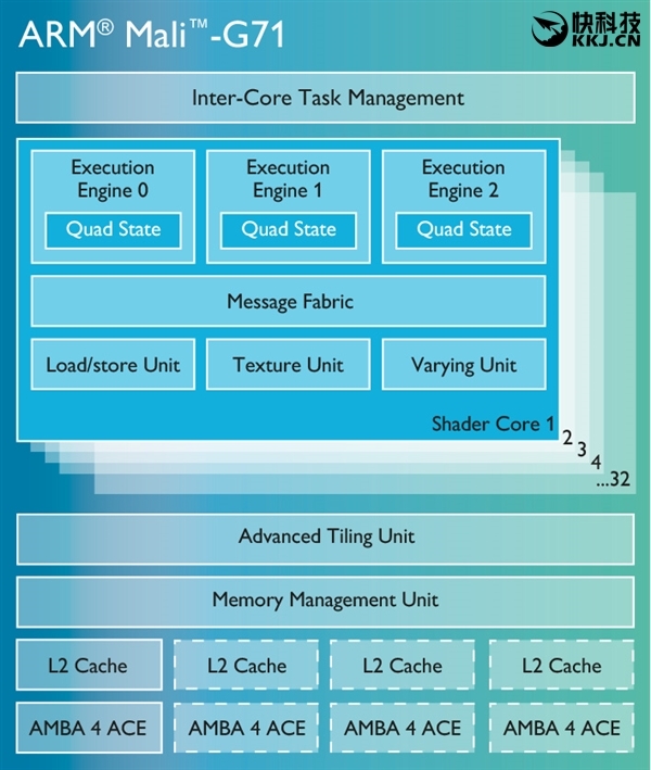 Mali-G71基于ARM全新的Bifrost微架构,可提供高端4K、VR体验,并支持OpenGL ES 3.2、Vulkan 1.0、GPU Compute、Android RenderScript API,即便是16nm工艺下在850MHz频率的时候也能带来27.2Gp/s的吞吐能力,两倍于Mali-T880。