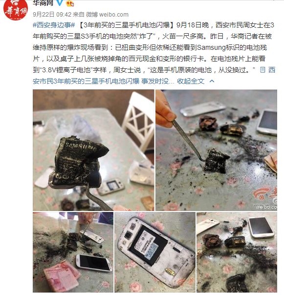 据微博认证媒体@华商网 报道,西安市民周女士3年前买的一部三星Galaxy S3手机突然“爆炸”。