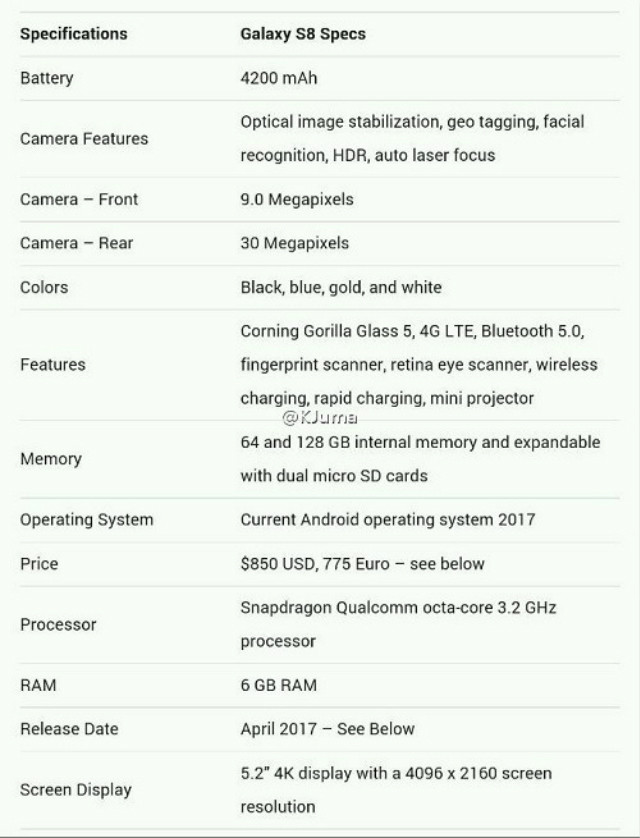 近日,据称Galaxy S8硬件规格已经在网络上泄露。此前传闻提到,GalaxyS8可以有两种型号,内部称为Dream和Dream2。这条传闻也得到证实,三星将推出Galaxy S8和Galaxy S8 Edge。GalaxyS8可能配备5.2英寸4K显示屏,系统内存6GB,存储空间有64GB或128GB,采用高通骁龙八核3.2GHz处理器,支持指纹和虹膜扫描。