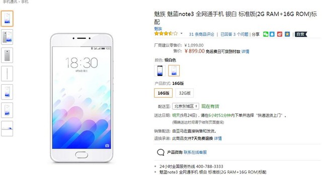 (中关村在线手机频道行情报道)2016年9月26日,魅族魅蓝note3(行货)在亚马逊商城热卖,该机目前最新售价为899元起。本机配件为:电池(内置)、充电器、数据线、说明书、保修卡等。魅族魅蓝note3是一款入门级别的全网通智能手机。